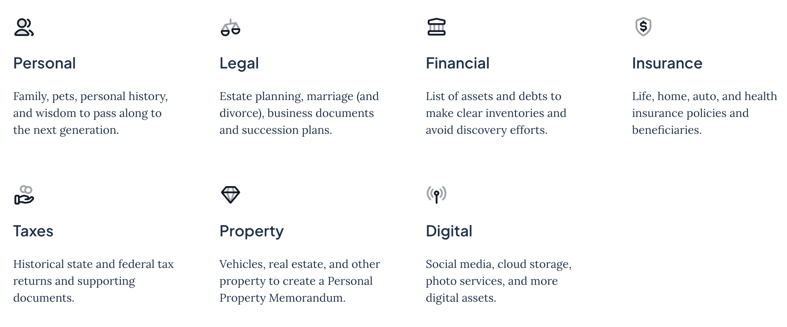 In addition to essential legal documents, it's critical to organize important estate information making it easy for your family to handle your affairs with confidence and peace of mind. Below are some of the areas we help you organize and share with a trusted individual...